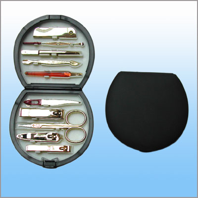 10件套(平口指甲钳,窄边型平口指甲钳,斜口指甲钳,耳扒,锉刀,刮刀,美容剪,表皮推刀,镊子,多功能刀)表面处理分为镀金(G)和镀银(C),材质为进口不锈钢.专利号:02242411.3, 02242412.1,